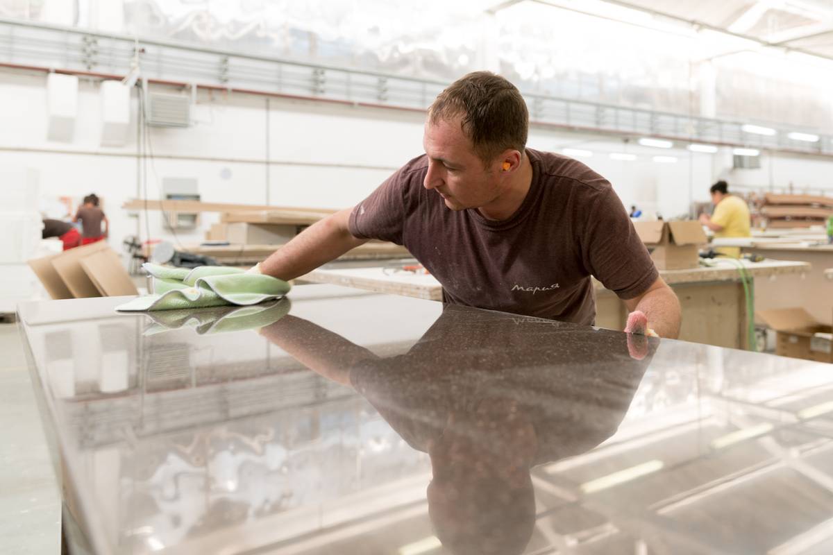 «Скульпторы» каждый месяц изготавливают более 1 500 столешниц из искусственного камня. Более 80% работ выполняется вручную.